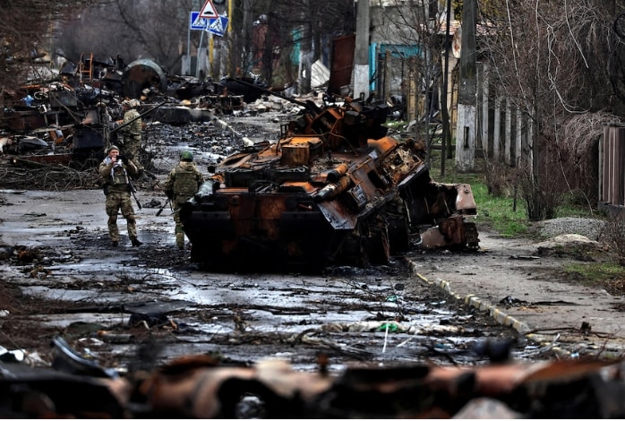 We must stop them and kick them out. Destroyed cars seen on a highway 20km from Kyiv near the town of Bucha. An in another accusation of war crimes Russian troops.